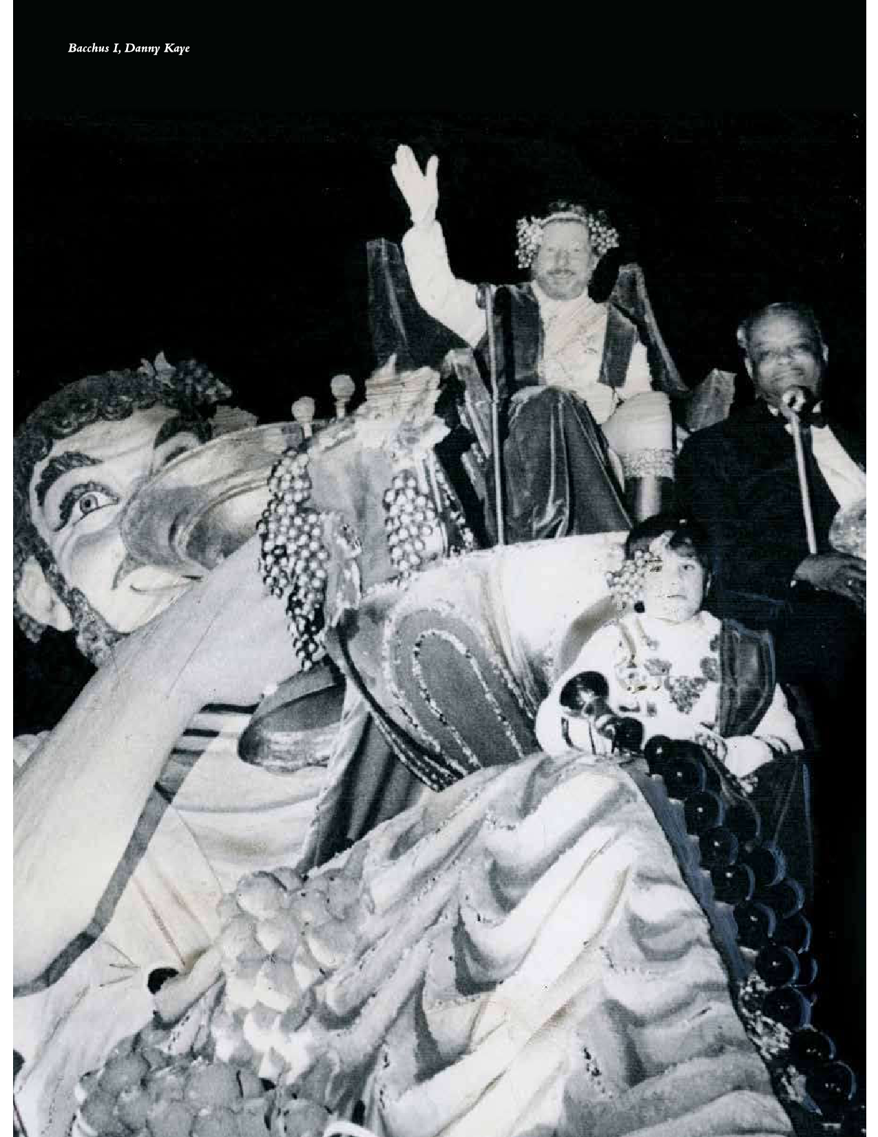 Charter Bacchus member Dr. Robert Cangelosi recalls, “Kaye was the best Bacchus we ever had. He was spectacular! He loved kids and worked for UNICEF. They had a throne for him and kids from all around the world at the Rendezvous. Kaye sat with the children on the floor instead of his throne. Kaye had his own plane and paid for his own travel to New Orleans and asked Bacchus to give the funds they would have paid for transportation to UNICEF.” Ken Smith, a charter member, agreed that Kaye was spectacular and one of the Krewe’s best kings. Co-Captain Dick Brennan’s wife Lynne recalled, “Well, I remember he came in thinking the king of Bacchus was supposed to be like Nero and would fling his cape around and everything…but when he got up on that float and he saw those millions of people screaming for him, the ego came out and he absolutely had the most wonderful ride in the world because he had no idea he would be so honored and so looked up to. It was fun to watch human nature.” Raymond Burr, Bacchus II, said of Kaye’s reign, “Oh boy, did he have fun. He told me there had never been anything like it in his whole life.”