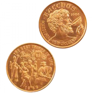 Bacchus would become known for the quality and quantity of its throws. The club’s initial parade doubloons sold at the following prices: .999 silver for $8 each, silver oxide for $3, antique bronze for $2.50 and a bag of 100 aluminum for $6.